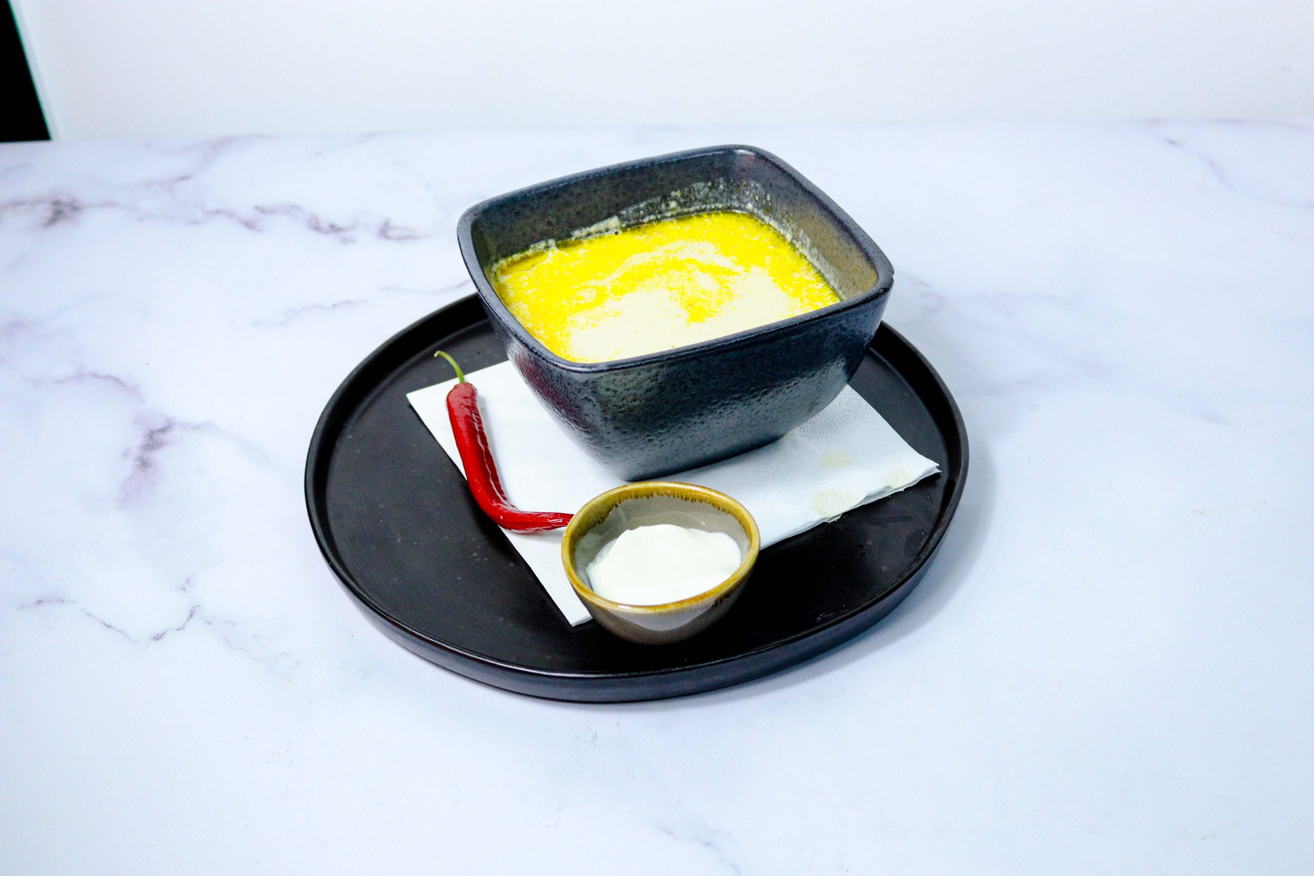 Cu mamaliga ci mujdei de usturoi Grilled lamb pastrami served with polenta and garlic sauce